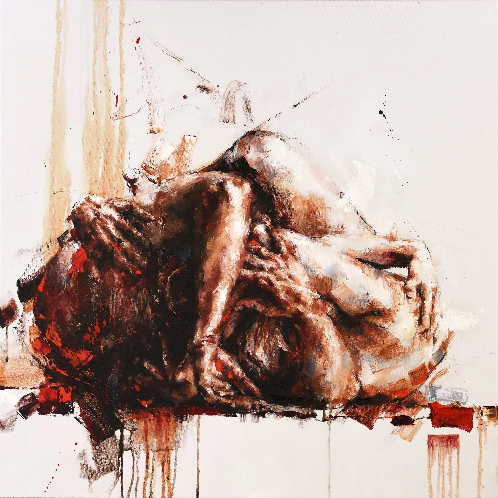 These pieces originated in late 2023. It is part of Antoine’s connection series and explores intimate emotional bonds. Although this series has a strong feminine energy, there is no direct depiction of gender. These latest two pieces also include 5th hands that emphasize the feeling of closeness, encouraging the viewer to lose track of where one figure ends and the next begins. Anda VI & VII are also larger than Antoine’s previous Anda pieces (which were 12x12” and 24x24”) This allows the viewer to be even more present in the moment.