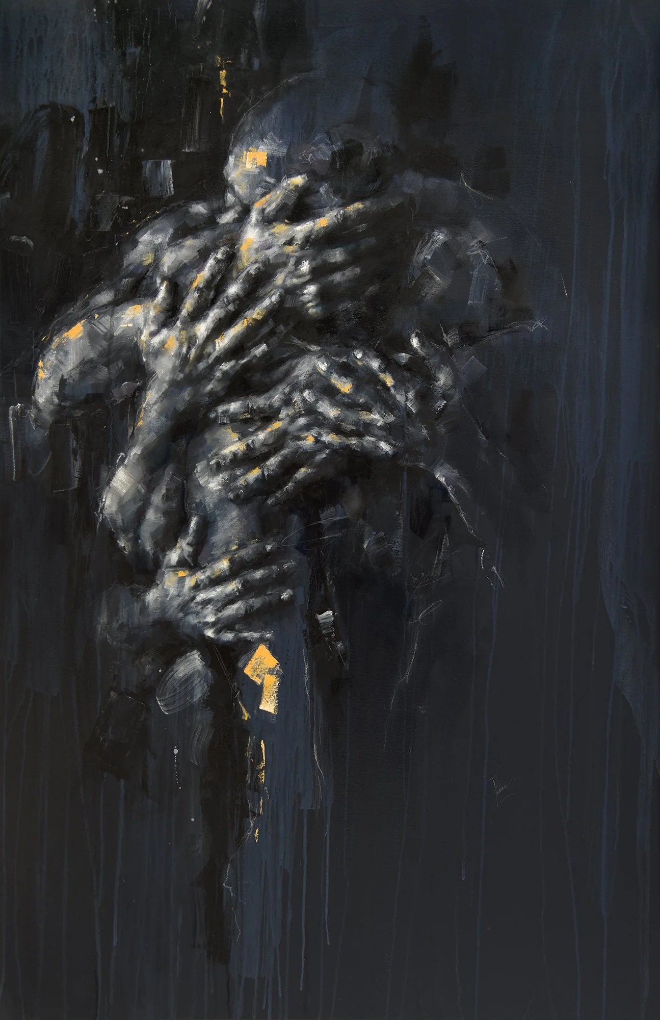 Expressionistic splatters and fast lines are juxtaposed to a softness in the hands with highlights of soft pale yellow. The figures appear from a mystic dark space, leaving it up to the viewer to complete the piece/moment/story. There is also a notable contrast between splatter, where control is surrendered, and against areas where touch takes place which is delicate and soft. The large scale of this piece also allows the viewer to feel present in the moment.